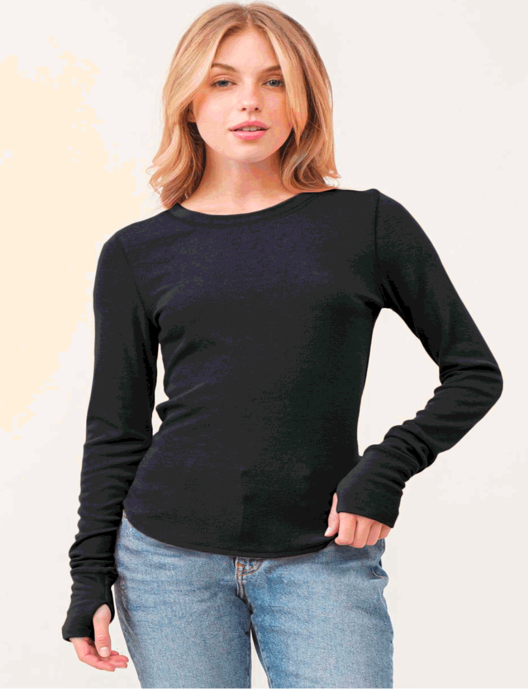 Details: Baby rib round neck long sleeve fitted top with thumb hole.