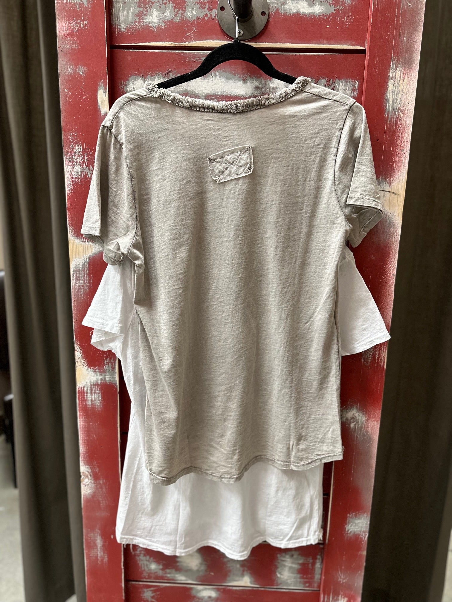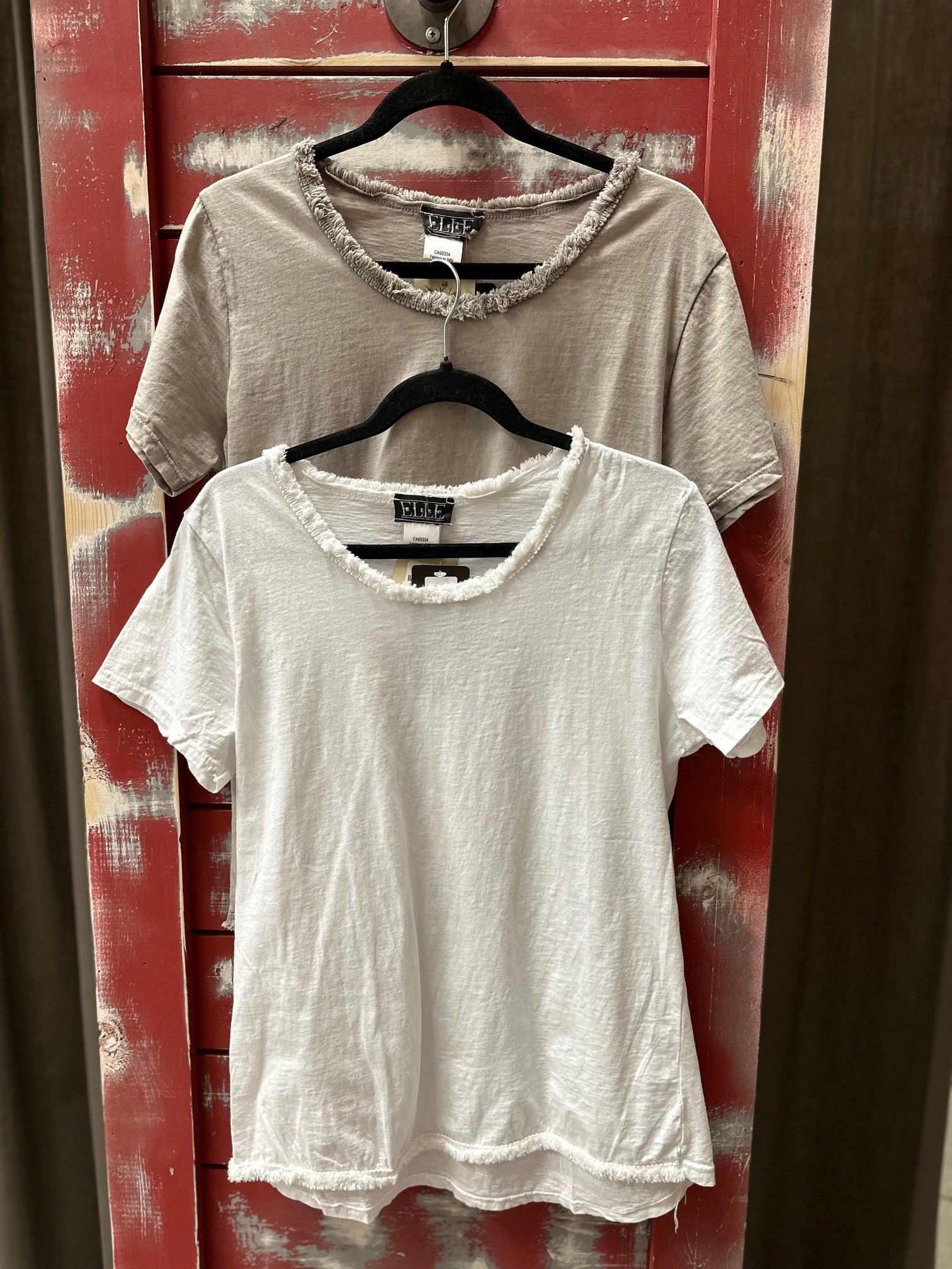Details: Crew neck short sleeve t-shirt w/ a rick rack trim neck & bottom.