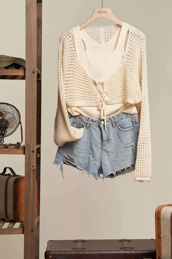 Details: Tie Front Open Front Crochet Crop Top Long Sleeve Sweater With Attached Tank Top.