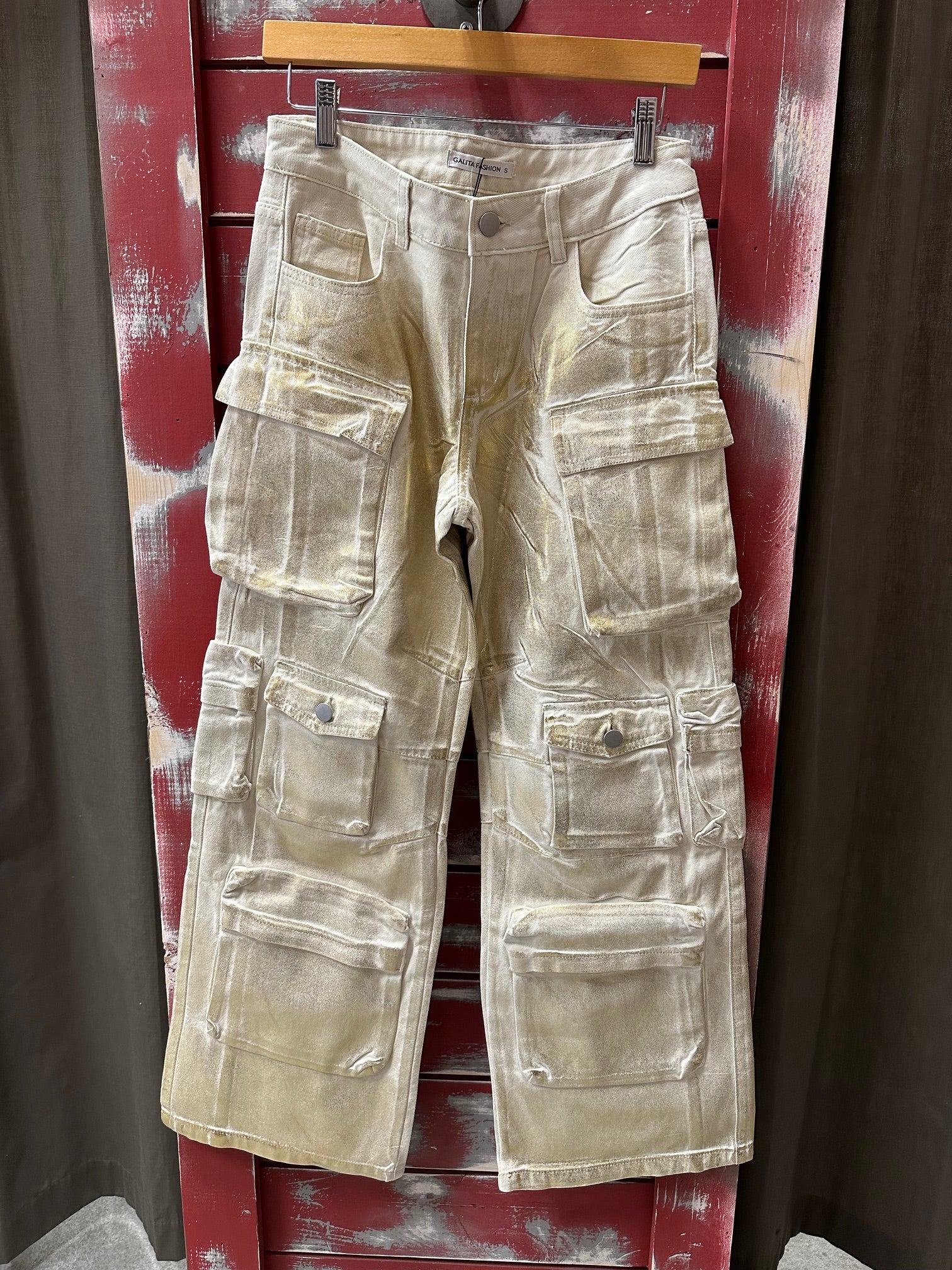 GOLD METALLIC DENIM WIDE LEG CARGO PANT