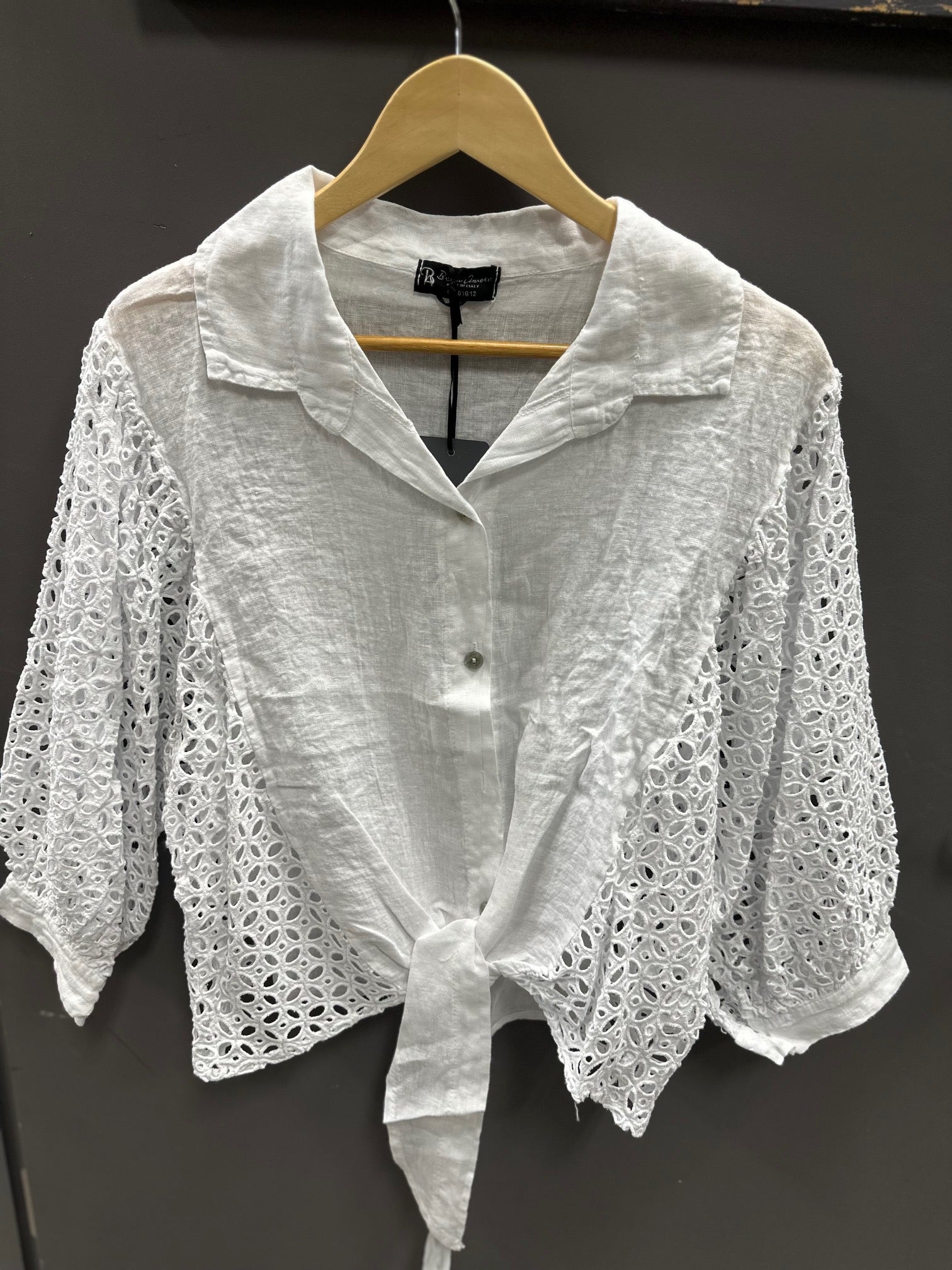 Details: Linen tie front button down blouse with lace 3/4 length sleeves.