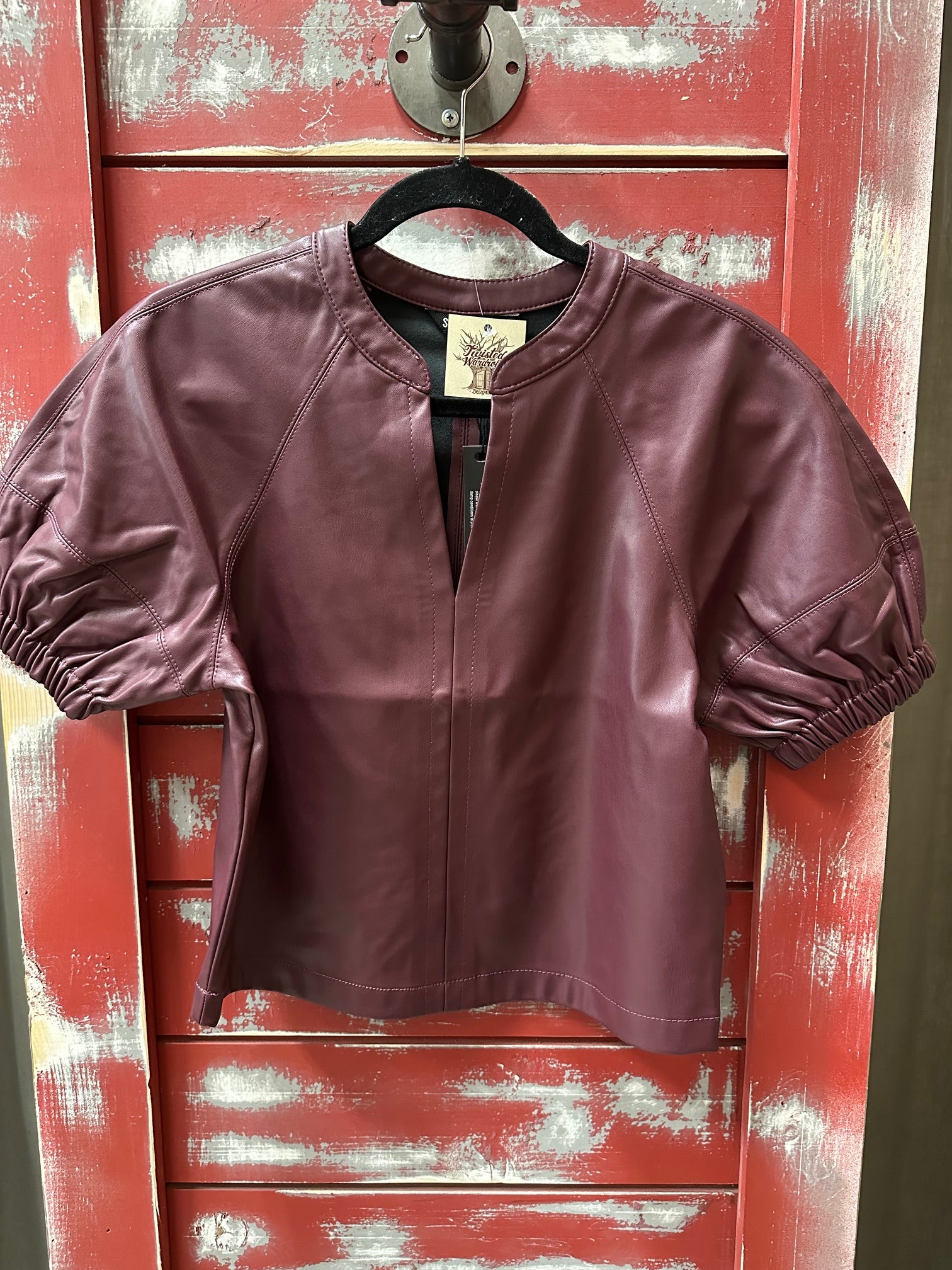 ROXANNE STEVE MADDEN FAUX LEATHER V CUT NECK SHORT SLEEVE TOP