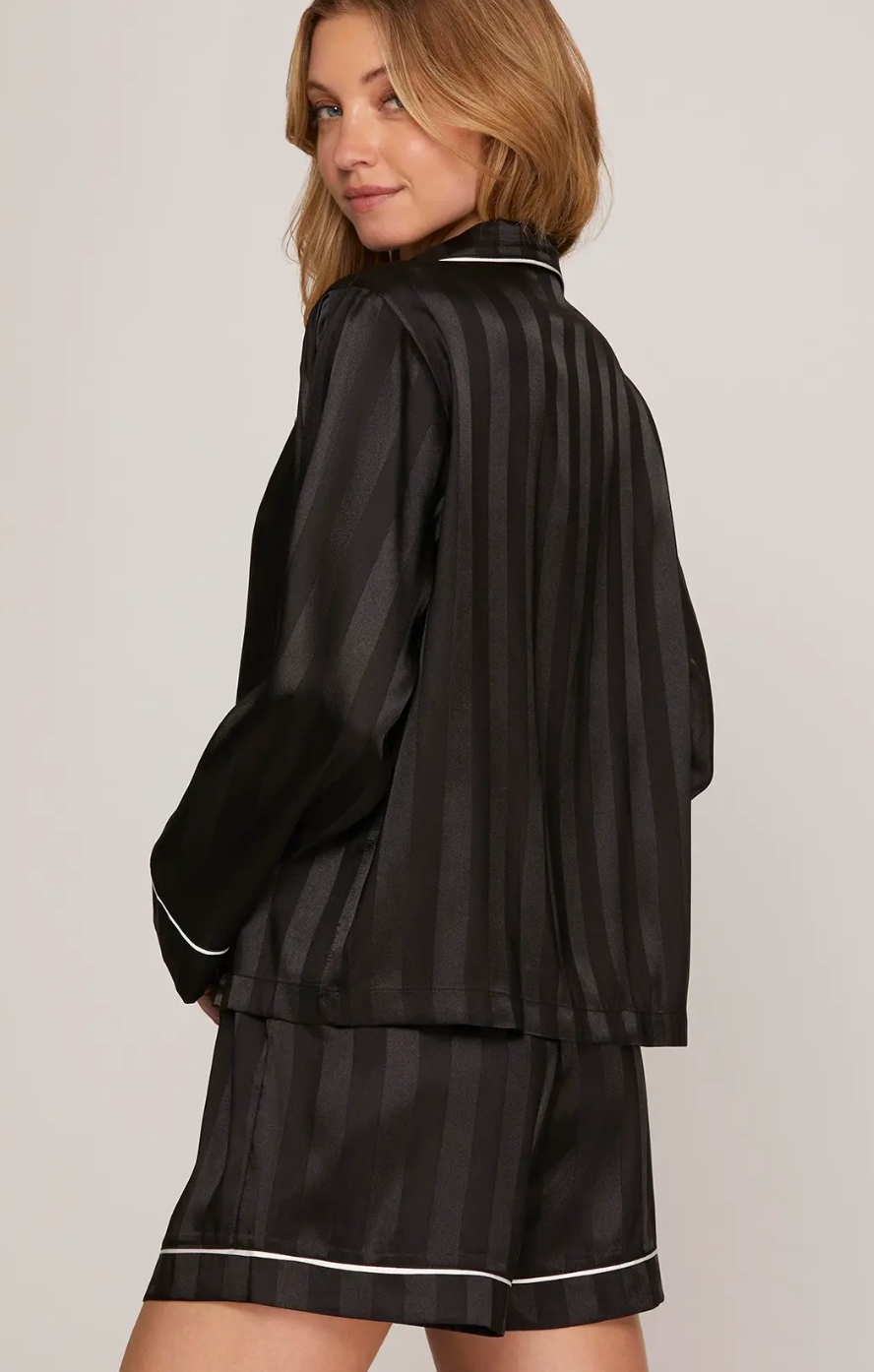 Details: Satin striped long sleeve top and shorts pajama set with detail piping.